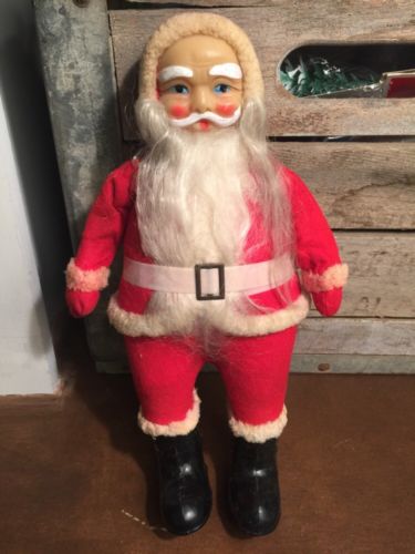 Title (ebay affiliate link): Antique Vtg Christmas 11"SANTA CLAUS w CELLULOID FACE Felt Suit Flocked Pants