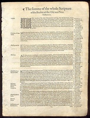 Title (ebay affiliate link): 1605 Geneva Black Letter Bible Leaf/PRELIMINARY/THE SUM OF THE SCRIPTURES!