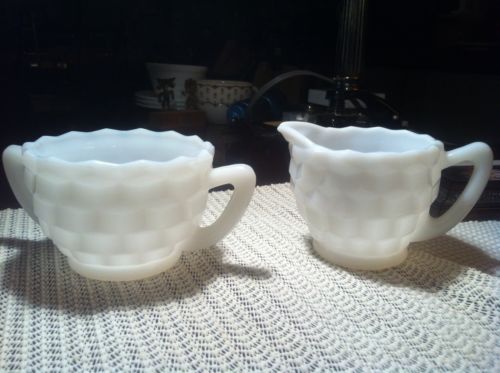 Title (ebay affiliate link): VINTAGE WHITE MILK GLASS CUBED PATTERN CREAMER & SUGAR BOWL