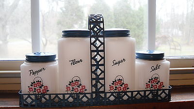Cute Vintage Tipp Milk Glass Red Flowers in Basket Set with Blue Rack & Covers