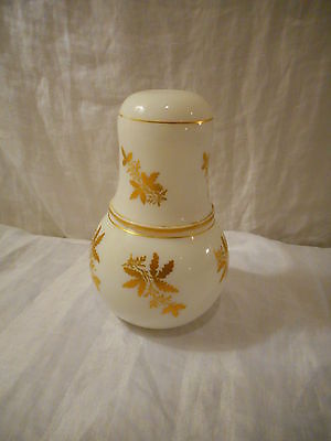 Vintage Bedside Milk Glass Pitcher or Carafe & Drinking Glass, Gold Leaves Trim
