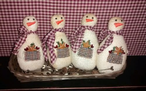 Title (ebay affiliate link): Set/four handmade primitive snowman ornies / bowl fillers with pockets and star.