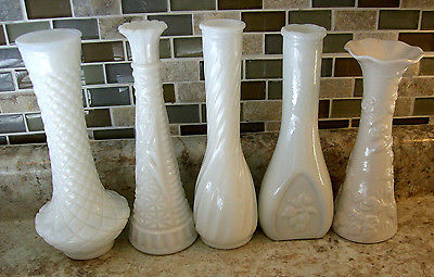 Lot of 5 Vintage White Milk Glass Flower Bud Vases