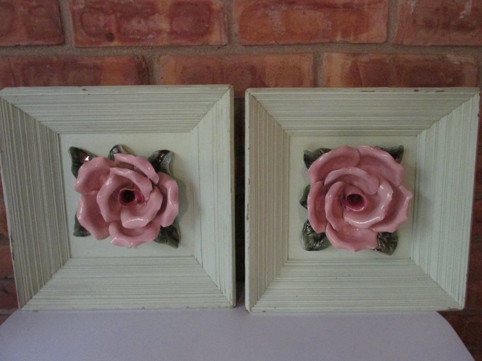 Title (ebay affiliate link): 2 LG. PORCELAIN SHABBY COTTAGE ROSE WALLHANGINGS SHADOWBOX WOOD PAINTED FRAMES