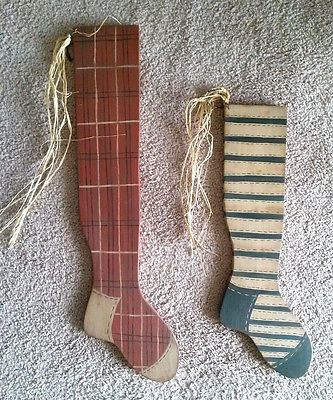 Title (ebay affiliate link): Pr. of primitive wooden hanging Christmas stockings. Wire hanger, raffia accent.