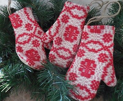Title (ebay affiliate link): Primitive Vintage CHRISTMAS Woven Red Coverlet Mitten Ornaments Winter Decor