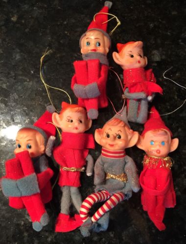 Title (ebay affiliate link): 6 Vintage Elves Japan Pixie Elf Knee Hugger Christmas Tree Ornaments