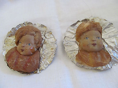 2 Antique Folk Art Snow Children Ornaments~Plaster Faces Spun Cotton Foil Back
