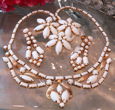 Title (ebay affiliate link): WEISS SIGNED MILK GLASS BAGUETTE 'RHINESTONE' BIB NECKLACE BROOCH EARRINGS LOT!