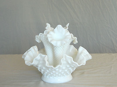 VINTAGE FENTON HOBNAIL EPERGNE MILK GLASS WHITE VASE W/ 3 REMOVABLE HORNS