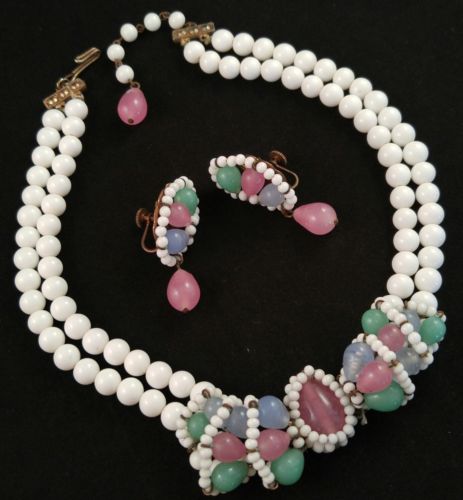 Title (ebay affiliate link): Signed JAPAN Vintage 15" Necklace & Earring SET Pink Blue Green Milk Glass X114
