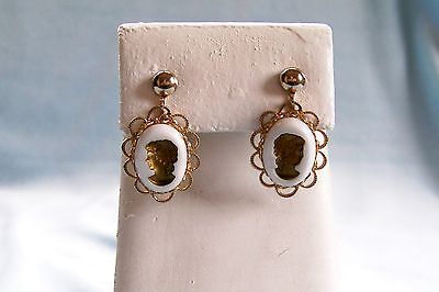 Vintage Intaglio Reverse Carved Milk Glass Gold Cameo Dangle Clip On Earrings