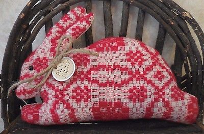 Primitive Christmas Rabbit Bunny Vintage Red Woven Coverlet Folk Art Bunny