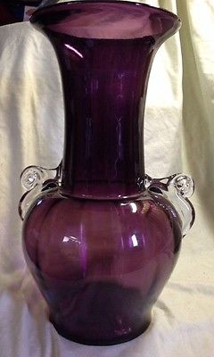 LARGE PURPLE/AMETHYST G;ASS/CRYSTAL VASE WITH APPLIED HANDLES