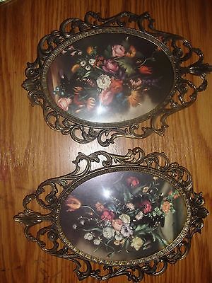 2 Vintage Oval Filigree Brass Picture Frames Ornate Made In Italy Convex Glass