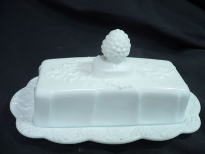 UNUSUAL MILK GLASS BUTTER DISH, GRAPES, LEAVES FINIAL