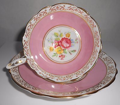 Royal Stafford Teacup & Saucer Pink Gold Gilt Flowers Scallop Edges Footed
