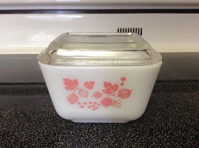 Title (ebay affiliate link): Vintage Pyrex Pink on White Gooseberry refrigerator dish milk glass 501 with lid