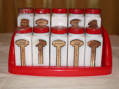 Vintage Art Deco Milk Glass Spice Jars w/Rack