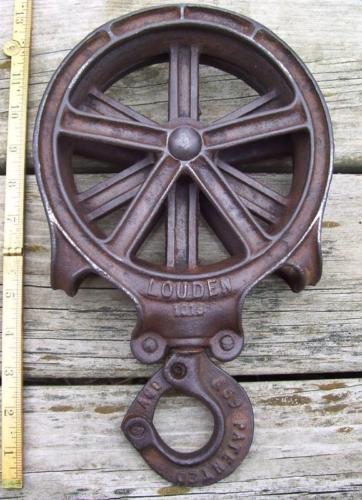 Title (ebay affiliate link): Antique Louden Hay Trolley Rope Hook Block Tackle Pulley Old Vtg Cast Iron Tool