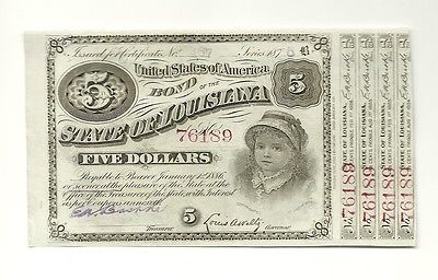 Post-Civil War $5.00 State of Louisiana "BABY BOND" 1870s UNC