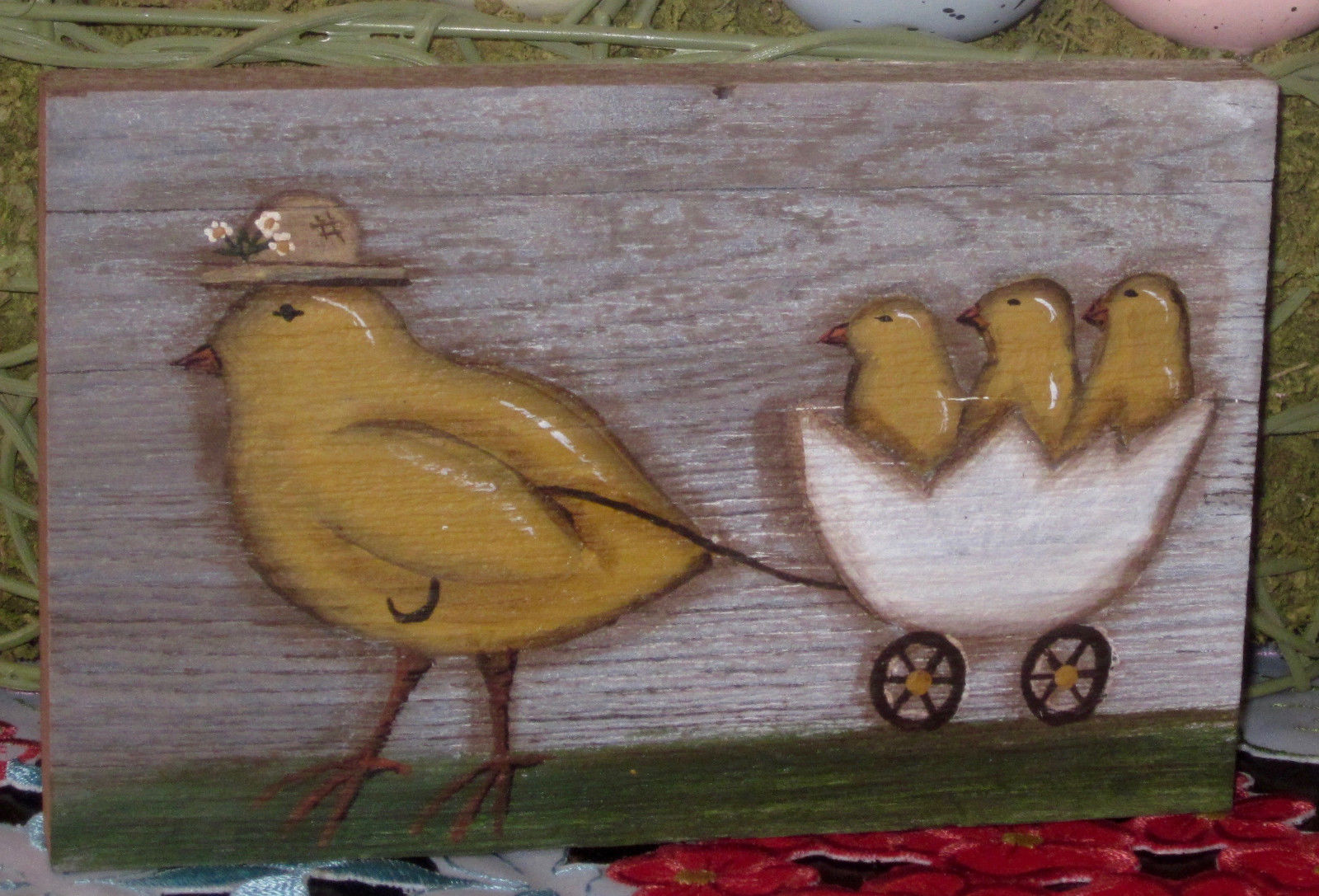 Title (ebay affiliate link): *~*PRIMITIVE*~*HP FOLK ART PRIM CHICK *~* EGG OF CHICKS *~* OLD RECLAIMED WOOD