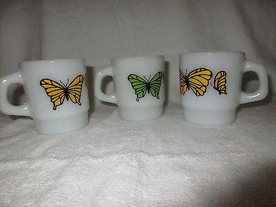 3 Butterfly Anchor Hocking USA White Milk Glass Coffee Cups Mugs