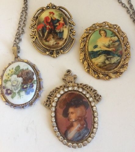 Title (ebay affiliate link): Vintage Milk Glass Transfer Cameo Lot 2 Pin Brooches 2 Pendants Necklac
