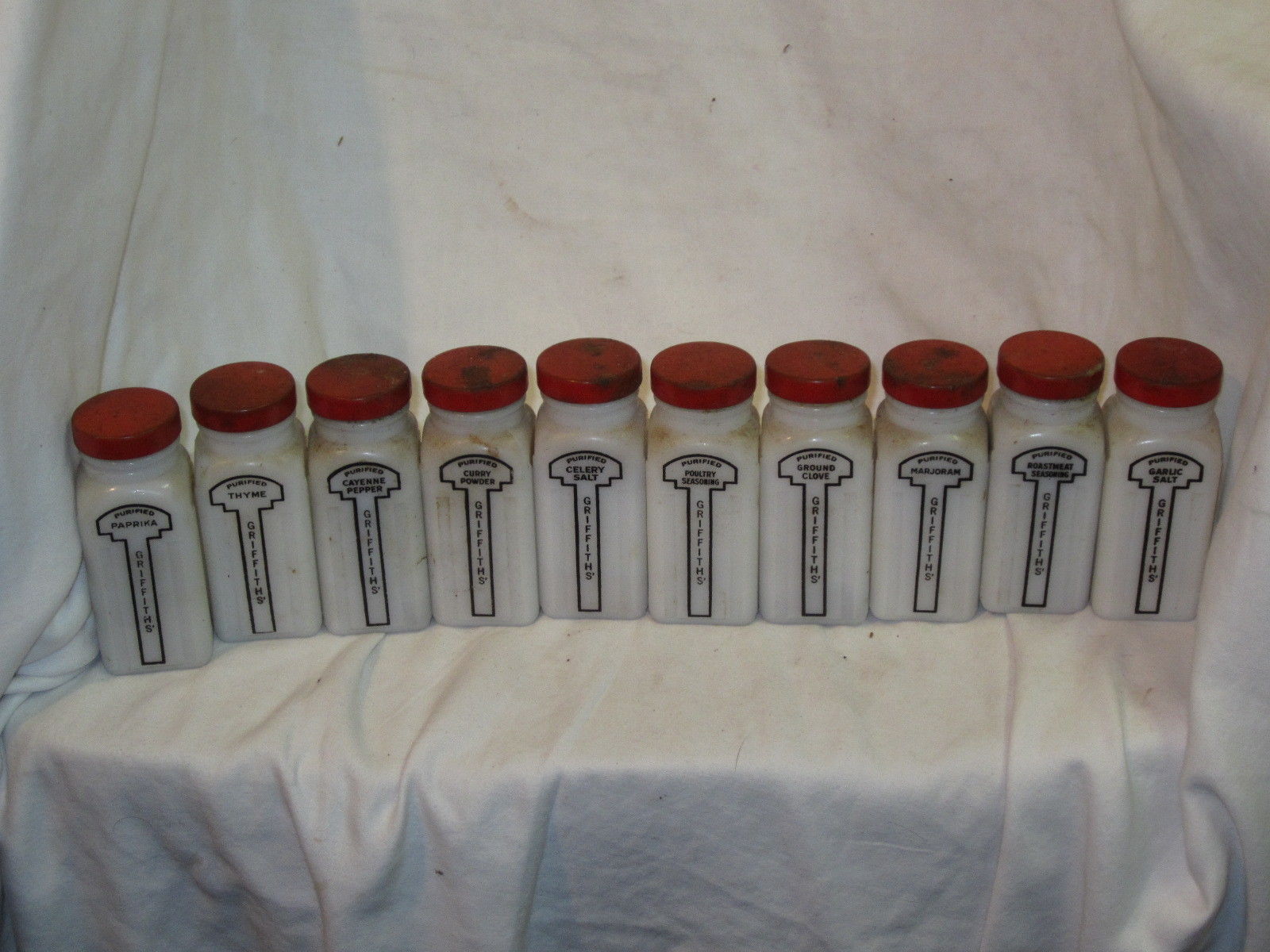 Title (ebay affiliate link): LOT OF 10 RED & WHITE MILK GLASS GRIFFITH'S SPICE SEASON JARS SHAKERS