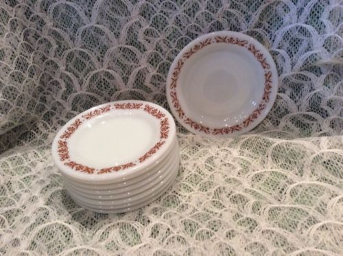 Title (ebay affiliate link): 8 Pyrex Copper Filigree 5 1/2" Bread Dessert Plates Milk Glass & 1 Coffee Saucer