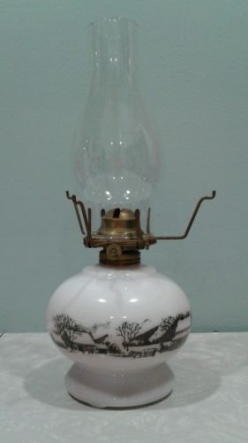 Title (ebay affiliate link): Currier & Ives white milk glass oil lamp with black winter farm scene