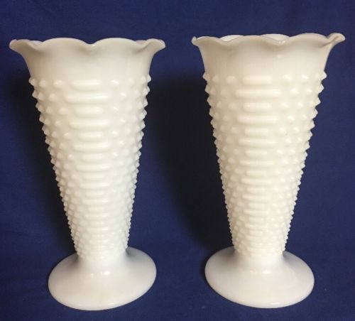 Title (ebay affiliate link): Lot of 2 Vintage 1960 White Milk Glass Hobnail Bars Trumpet Flower Vase 9 1/2"