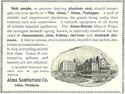 Title (ebay affiliate link): 1896 ALMA SANITARIUM COMPANY, ALMA, MICHIGAN MINERAL WATER CURE ADVERTISEMENT