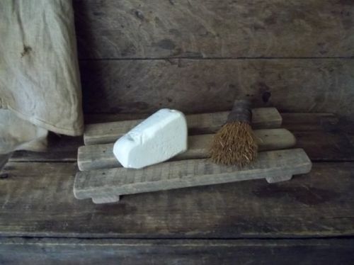 Primitive wooden make-do riser~old lye soap~scrubber-sink side gathering