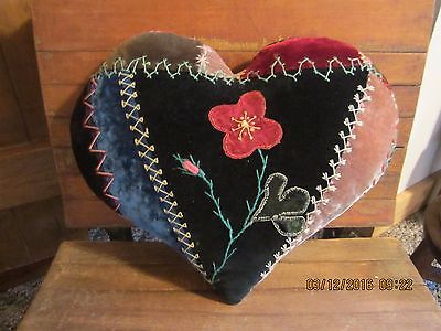 PRIMITIVE~FOLK ART~HANDMADE VINTAGE VELVET CRAZY QUILT HEART PILLOW~~