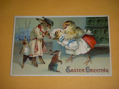 EASTER GREETING - DAD IS A RABBIT, MOTHER IS CHICKEN WITH BABY CHICK-EARLY 1900s