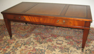 Title (ebay affiliate link): 1940s ERA MAHOGANY TRIPLE LEATHER TOP COFFEE TABLE