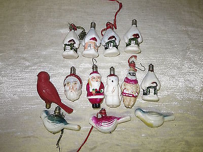 VINTAGE LOT 13 FIGURAL PAINTED MILK GLASS CHRISTMAS LIGHT BULBS SANTA BIRD HOUSE