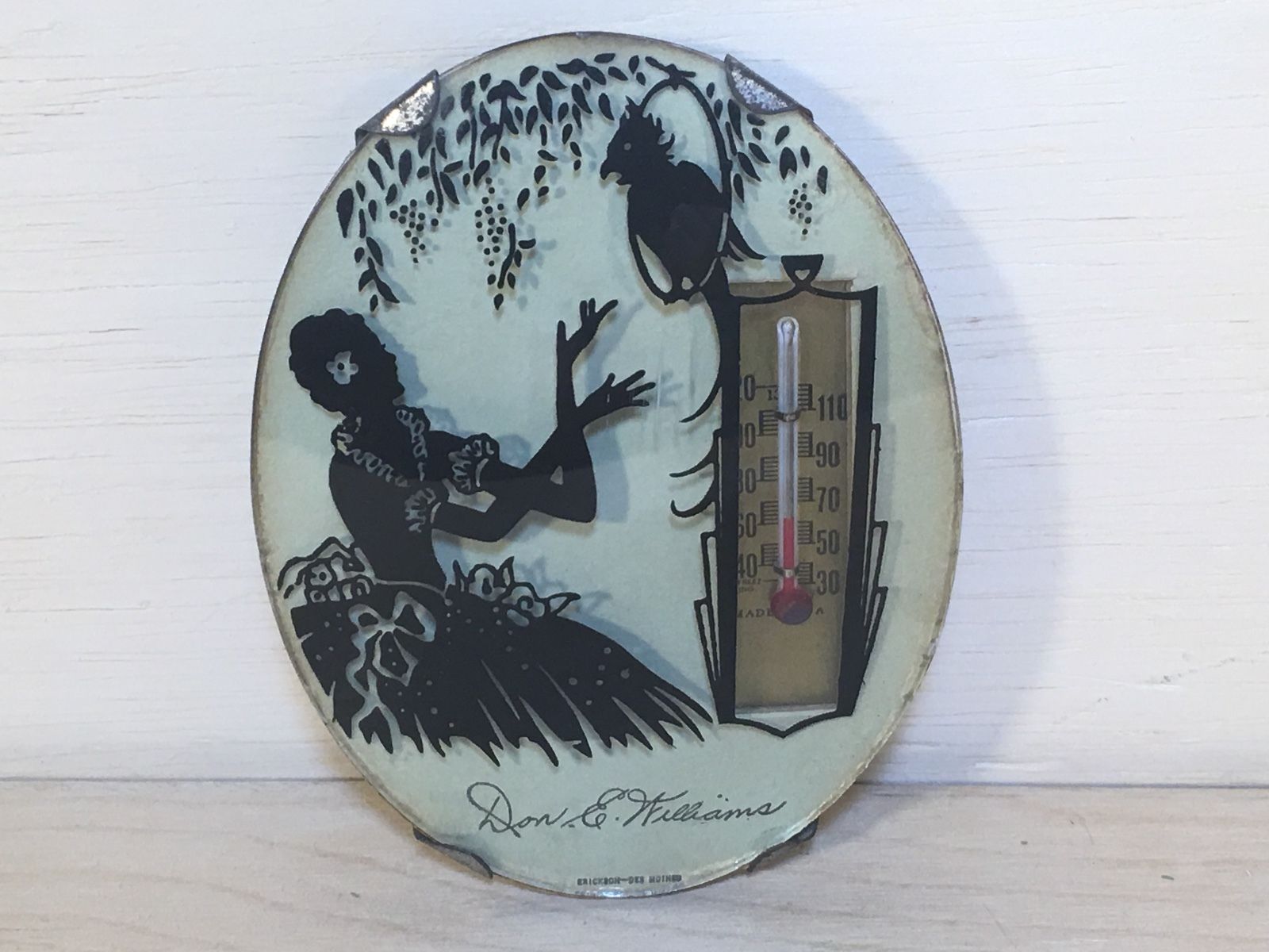 Title (ebay affiliate link): Vintage DON E WILLIAMS Silhouette Art on Glass thermometer Lady with Parrot