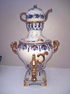 USSR VINTAGE PORCELAIN GZHEL SAMOVAR TEAPOT SET BLUE GOLD
