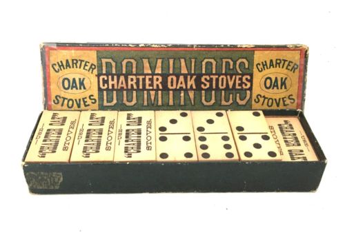 Title (ebay affiliate link): ANTIQUE VINTAGE CHARTER OAK STOVES ADVERTISING DOMINOES WOOD WOODEN BOX