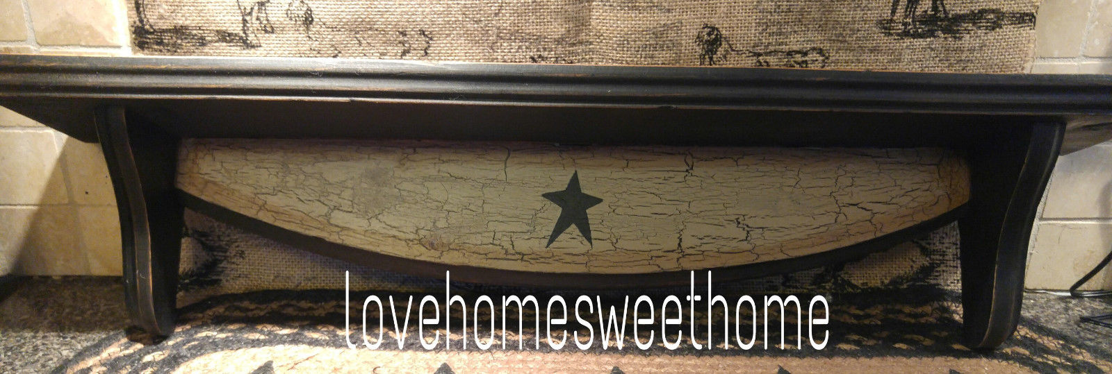Title (ebay affiliate link): Primitive Crackle Tan & Black Star Wood Shelf ~ Country Decor