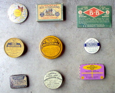Title (ebay affiliate link): Assortment of 7 Older Tin Containers plus Paper Headache and Paper Soap.