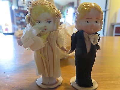VINTAGE 30'S BRIDE GROOM WEDDING CAKE TOPPER DOLLS CREPE PAPER OUTFIT MINIATURE