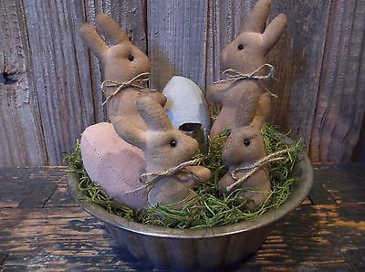 Gathering of Sweet Prim Bunnies & Eggs in Vintage Tin Cake Mold - Easter/Spring