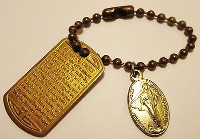ANTIQUE LORDS PRAYER DOG TAG WITH VIRGIN MARY MEDAL BRASS BRONZE KEY CHAIN
