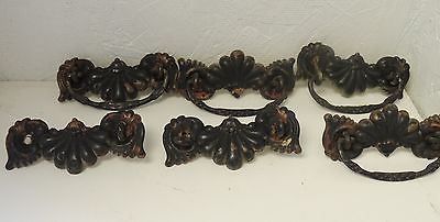 6 Antique Brass Stamped Drawer Dresser Hardware - missing 2 Pulls Painted Black