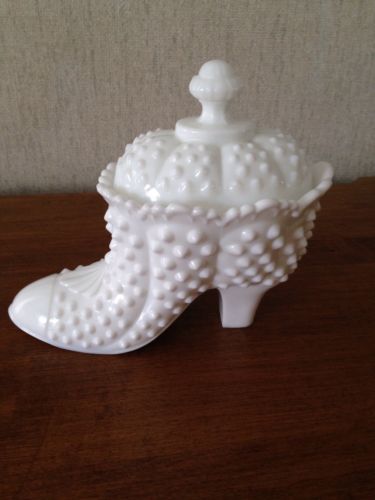 VINTAGE FENTON HOBNAIL WHITE MILK GLASS CANDY DISH SHOE WITH LID