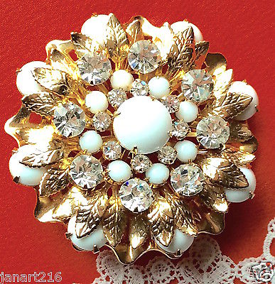 Title (ebay affiliate link): MINTY Vintage Rhinestone BROOCH Pin White Milk Glass Gold Tone Leaves Floral !