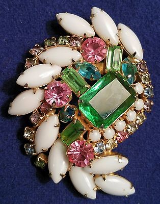 Vintage Milk Glass Rhinestone Fan Brooch Pin